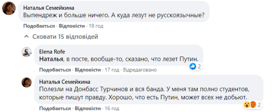Наталья Семейкина оставила под перепостом Беки комментарий: "Выпендреж и больше ничего. А куда лезут не русскоязычные?", - намекнула она на вторую сторону конфликта, то есть ВСУ.
