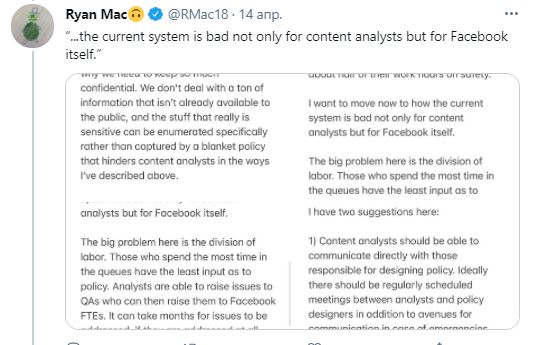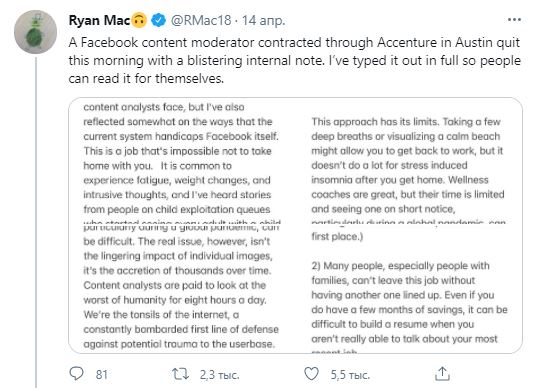 На днях бывший сотрудник ирландской компании Accenture, которая занимается модерированием контента на аутсорсинге для Facebook, опубликовал письмо в Twitter, в котором перечислил проблемы модераторов. На Facebook автор проработал два с половиной года.