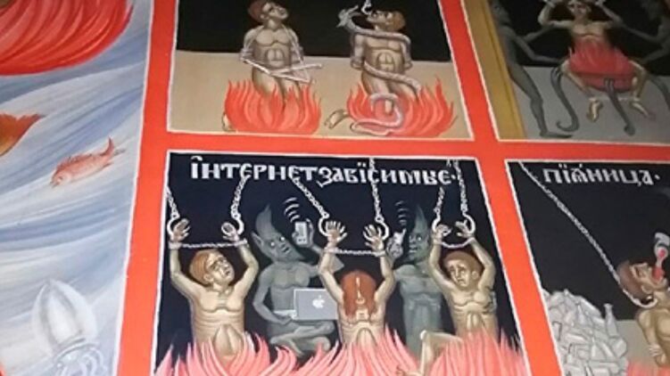 Фрески с чертями, держащими в руках смартфоны и ноутбуки, которые появились в храме в Тверской области России, отражают актуальные духу времени смертные грехи людей, в частности, интернет-зависимость.