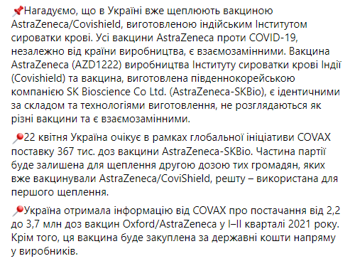 "Украина получила информацию от COVAX о поставках от 2,2 до 3,7 млн доз вакцин Oxford/AstraZeneca в I-II квартале 2021 года. Кроме того, эта вакцина будет закуплена за государственные средства напрямую у производителей", - добавили в ведомстве.