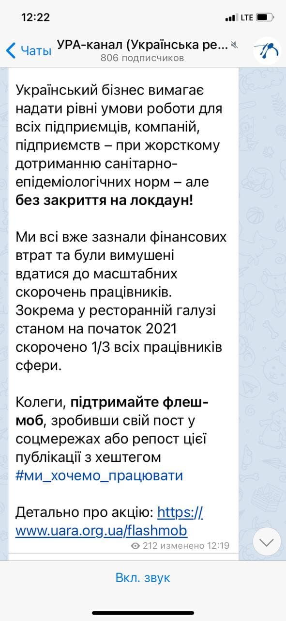 Украинская ресторанная ассоциация присоединилась к всеукраинскому флешмобу "Мы хотим работать", который стартовал в среду, 28 апреля.