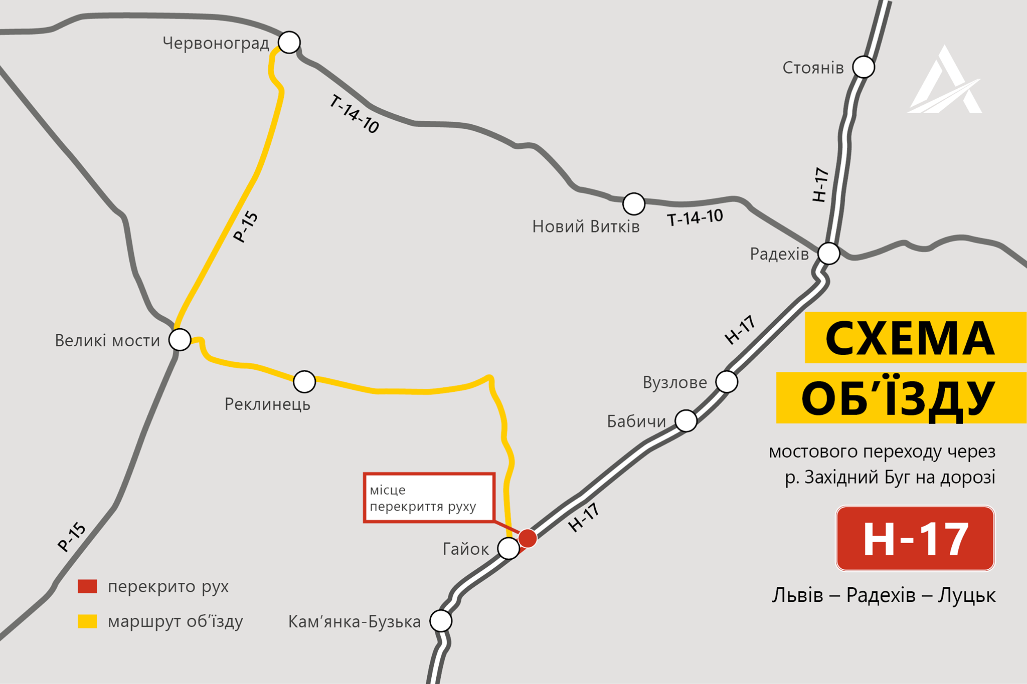 Сейчас уже организован объезд. Со стороны Львова - до города Каменка-Бугская, там поворот налево и нужно ехать по дороге на Жовкву. Далее по трассе Р-15 в Червоноград. В обратном направлении - аналогичная схема движения.