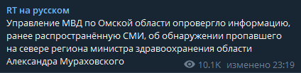 Кроме того, как сообщает RT в Телеграме, в УМВД по Омской области также опровергли информацию об обнаружении министра.