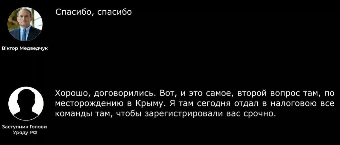 Интересно, что до аннексии участком владела украинская фирма с таким же названием, получившая лицензию в 2012 году. Из разговора следует, что речь идет о перерегистрации этого юрлица на территории РФ, которое, судя по пленкам, лоббирует Медведчук.