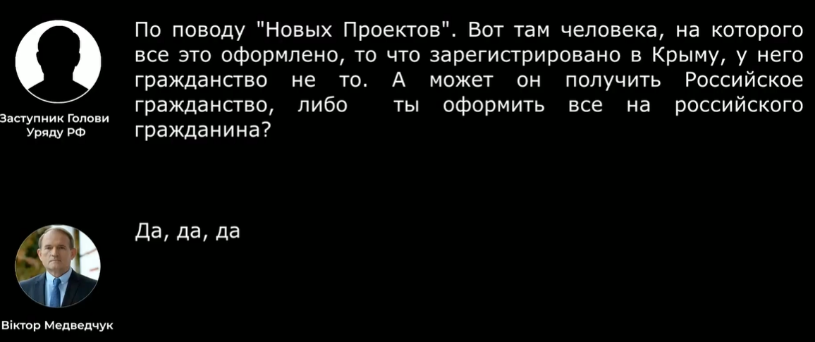 Журналисты сообщили, что Медведчук и его жена владеют в Крыму действующим газовым бизнесом - говорилось, что уже после аннексии он стал контролировать месторождение "Глубокое" в Черном море через компанию "Новые проекты", оформленную на подставное лицо.