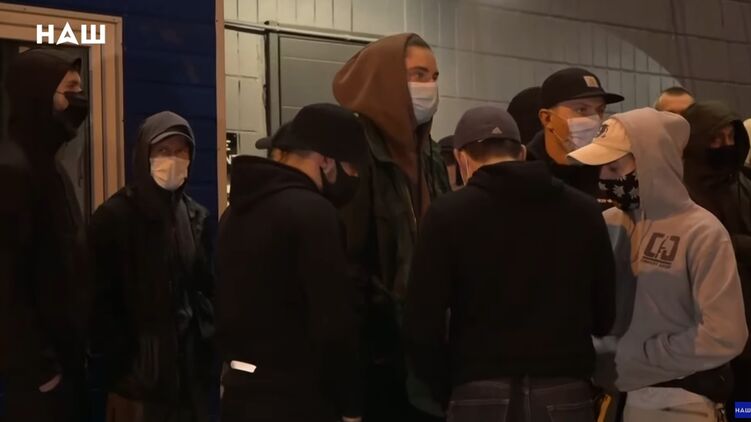 Под телеканалом "Наш" вечером 12 мая собралась группа молодых людей спортивной наружности.