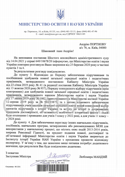 Письмо адресовано юристу Андрею Портнову, который в январе и апреле 2021 года выиграл два суда у Минобразования - основной и апелляционный.