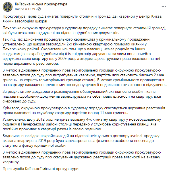 "С целью восстановления нарушенных прав территориальной общины окружной прокуратурой заявлен иск в суд об истребовании квартиры, стоимость которой составляет около 2 млн гривен, в пользу территориальной общины столицы. В рамках уголовного производства на квартиру наложен арест с целью недопущения дальнейшего незаконного отчуждения", - пишут в пресс-центре.
