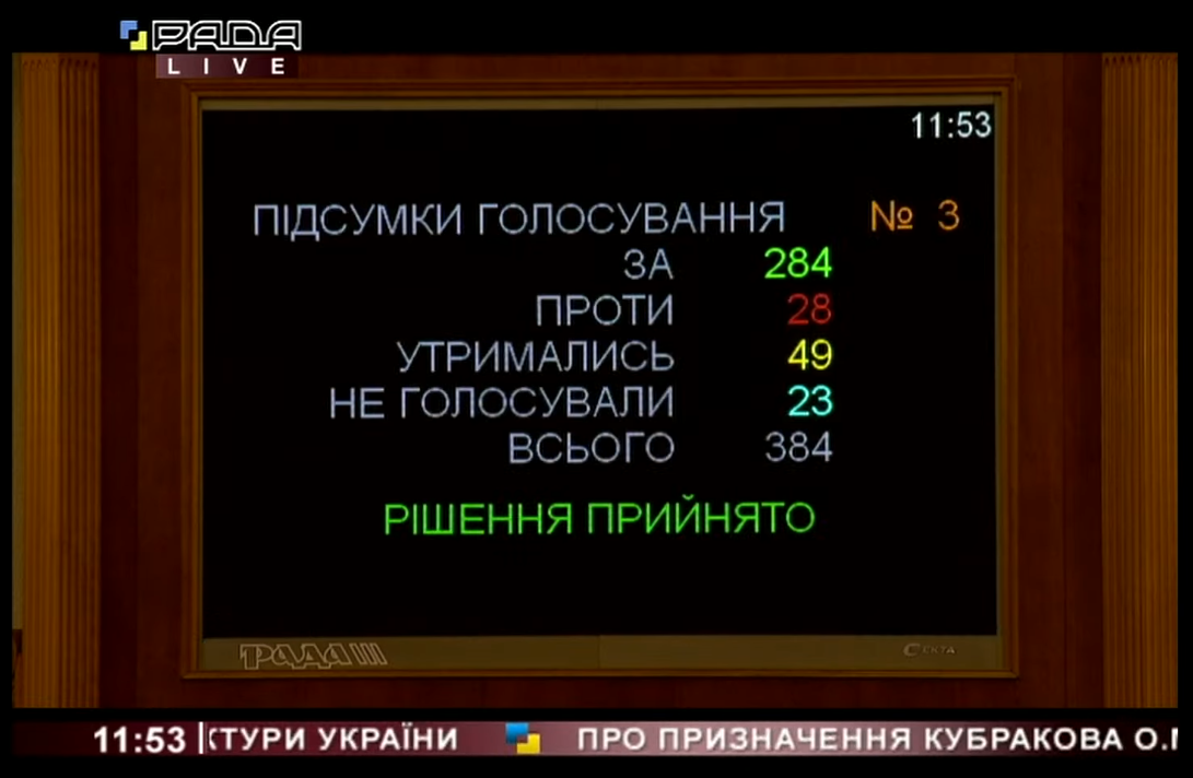 "За" проголосовали 284 депутата. Голоса распределились следующим образом: