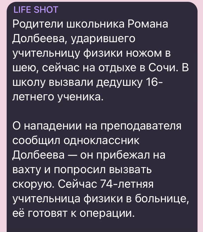 По данным Telegram-канала Life shot нападавшего зовут Роман Долбеев, он ученик 10-го класса. Родители школьника сейчас находятся на отдыхе в Сочи, поэтому в школу вызвали его дедушку.