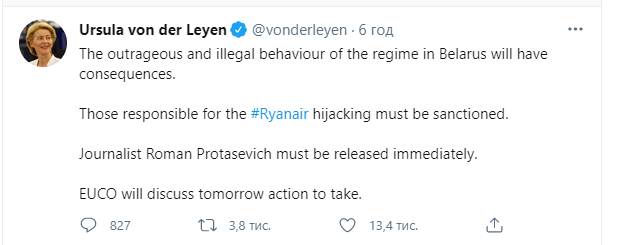 "Возмутительное и незаконное поведение (...) будет иметь последствия. Ответственные (...) должны быть наказаны. Журналист Роман Протасевич должен быть немедленно освобожден. Европейский совет обсудит завтра, какие действия предпринять", - написала глава ЕК в твиттере