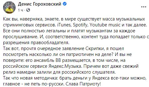 Также Скрипке уже напомнили, что такая позиция не мешает ему получать доход с композиций, размещенных на российском сервисе "Яндекс.Музыка".