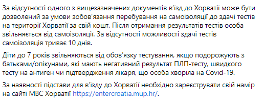 В публикации также идет речь о том, что согласно решению штаба гражданской защиты Республики Хорватия, лица, путешествующие в Хорватию с туристической целью, имеют право на въезд в страну при наличии документального подтверждения об уплате отеля/апартаментов/Кемпа/ астных усадеб/yайма яхты, или подтверждение о собственности жилья, или яхты в Хорватии.