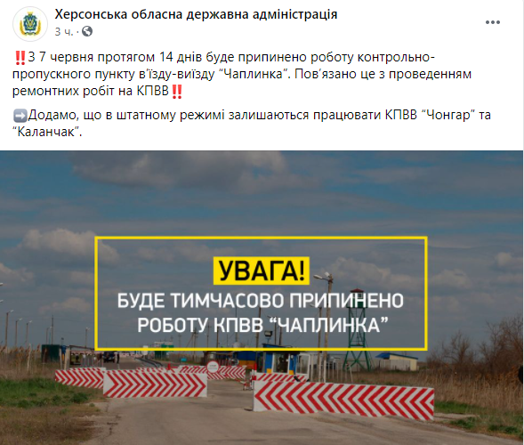 Расположенный на административной границе между Херсонской областью и аннексированным Крымом контрольно-пропускной пункт въезда и выезда "Чаплинка" с понедельника, 7 июня, будет закрыт на две недели. Причиной этого станет проведение ремонтных работ. Об этом сообщается на странице Херсонской облгосадминистрации в соцсети.