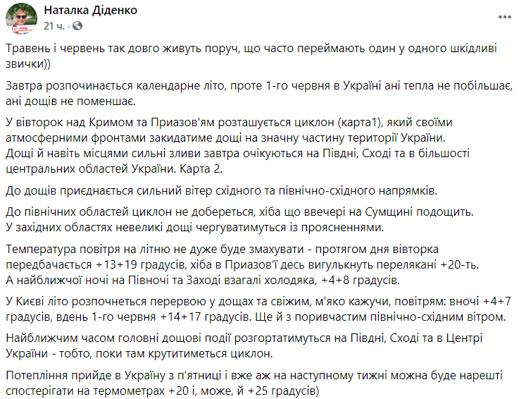 "Начинается календарное лето, однако 1 июня в Украине тепла не прибавится, а дожди не уменьшатся. Во вторник над Крымом и Приазовьем расположится циклон, который своими атмосферными фронтами забросает дождями значительную часть территории Украины.