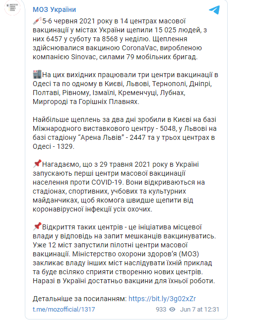 15025 человек получили прививки от коронавируса в 14 украинских центрах массовой вакцинации в минувшие выходные, 5-6 июня. При этом 6457 украинцев были вакцинированы в субботу и 8568 - в воскресенье. Прививки проводились препаратом CoronaVac, произведенной компанией Sinovac и силами 79 мобильных бригад.