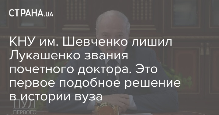 Президента Беларуси Александра Лукашенко лишили звания почетного доктора Киевского национального университета имени Шевченко, которое он получил в период президентства Виктора Ющенко. Ученый совет столичного вуза принял за это решение путем тайного голосования. Об этом сообщает ВВС News Украина со ссылкой на источник, близкий к руководству КНУ им. Шевченко.