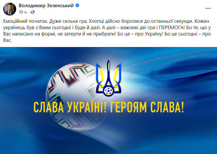 Владимир Зеленский в своем посте в Фейсбуке сразу "зашел с козырей" - лозунга "героям слава", который УЕФА сочла политически окрашенным и требовала убрать с формы украинской сборной.