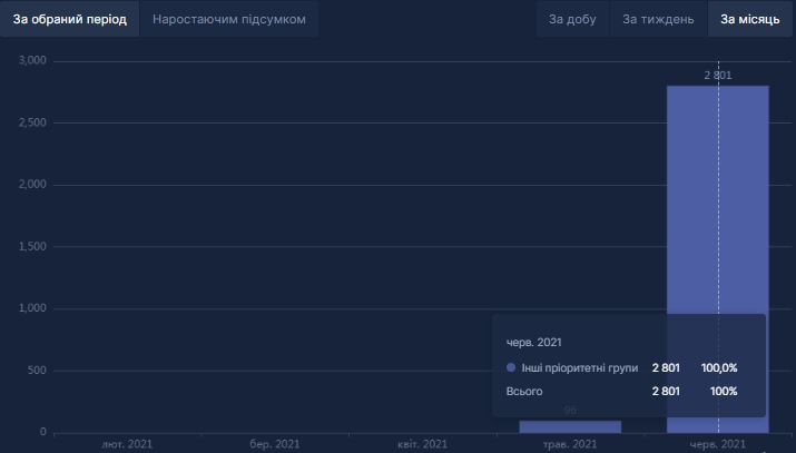 В пунктах вакцинации в регионах украинцев, которые входят в категории, попадающие под вакцинацию, до июня чаще всего кололи "АстраЗенекой" индийского и южнокорейского производства. Пик пришелся на апрель.