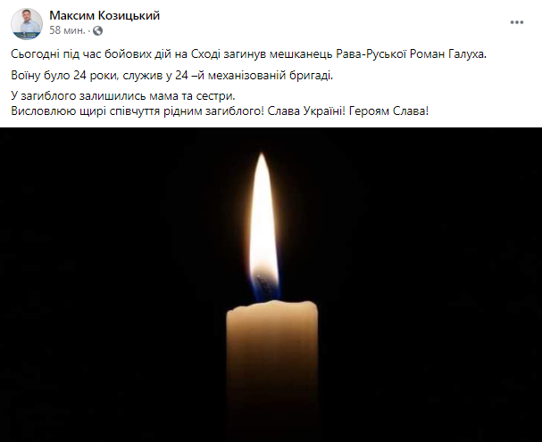 "Сегодня во время боевых действий на Востоке погиб житель Рава-Русской Роман Галуха. Воину было 24 года, служил в 24-й механизированной бригаде. У погибшего остались мама и сестры", - написал губернатор Львовской области.