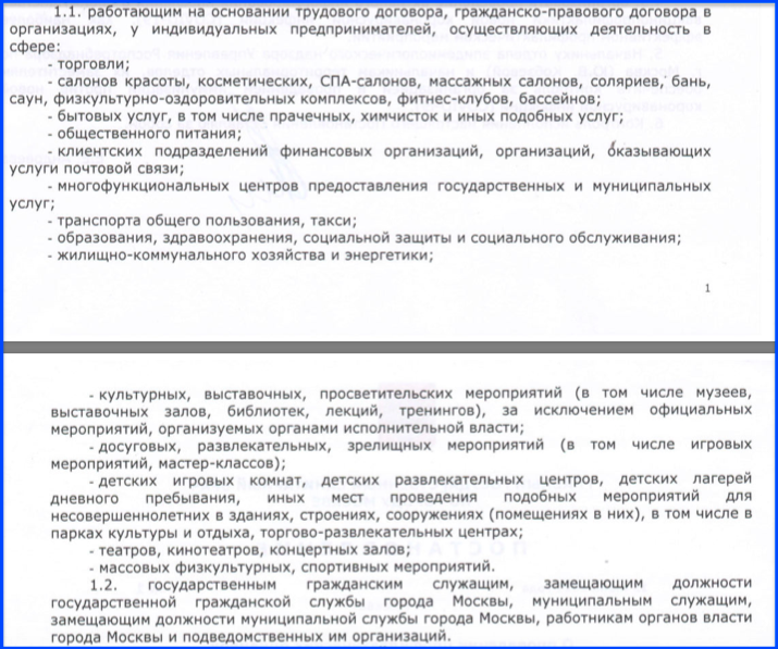 Согласно распоряжению главного санврача Москвы, до 15 июля в организациях, подпадающих под действие указа, должно быть привито первым компонентом вакцины не менее 60% сотрудников. Спустя месяц такая же доля работников должна получить второй компонент вакцины.
