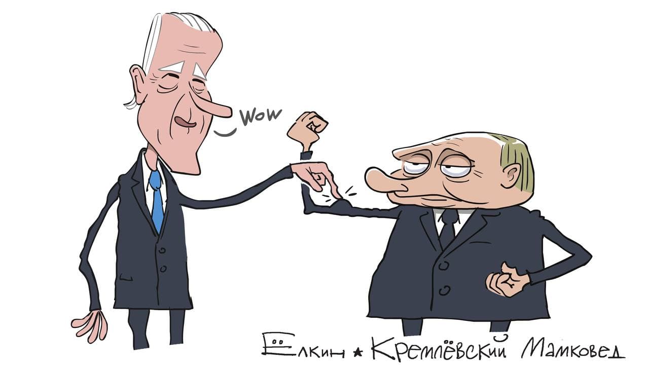Российский карикатурист Сергей Елкин обыграл дружелюбное отношение Байдена к Путину.