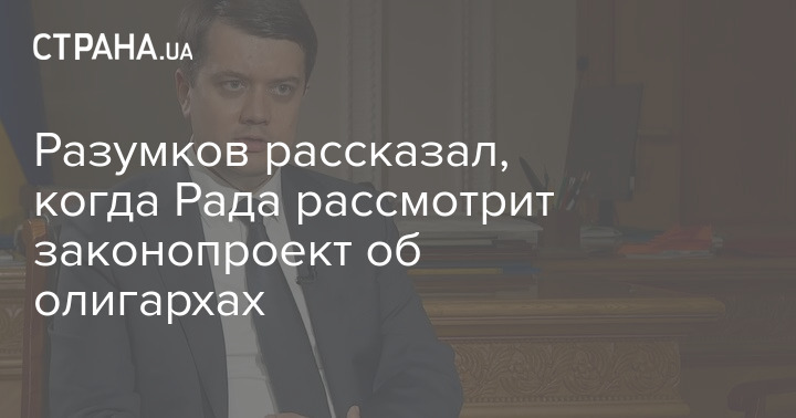 Спикер Верховной Рады Дмитрий Разумков заявил, что Рада рассмотрит законопроект об олигархах (№5599) и альтернативные законопроекты (№5599-1, 5599-2, 5599-3) до конца текущей сессии.
