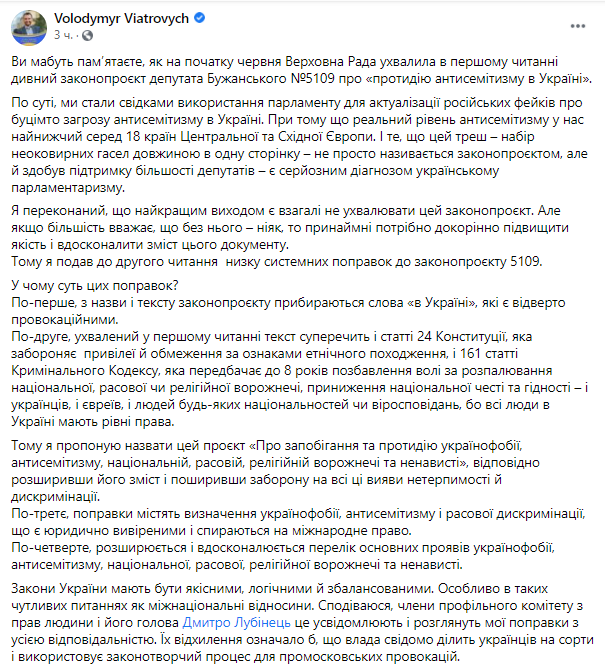 Также он предложил добавить в закон понятие "украинофобия" и отразить это в названии перед антисемитизмом. То есть в интерпретации Вятровича закон звучал бы так "О предотвращении и противодействии украинофобии, антисемитизма, национальной, расовой, религиозной вражды и ненависти"".