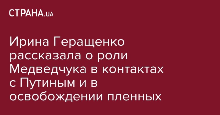 «Однако в гуманитарной группе мы работаем исключительно по вопросам освобождения пленных. А что касается Медведчука, то он ведет переговоры с другой стороной. В телефонных переговорах с президентом Украины Путин говорит: "Да, эти досье надо передать г-ну Медведчуку, и он продолжит эту работу". И он вел эти переговоры», — добавила Геращенко.