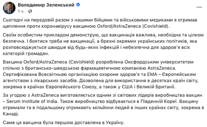 Именно эта вакцина была первой доставлена в Украину", - писал Зеленский в марте, когда получил первую дозу "Ковишилда".