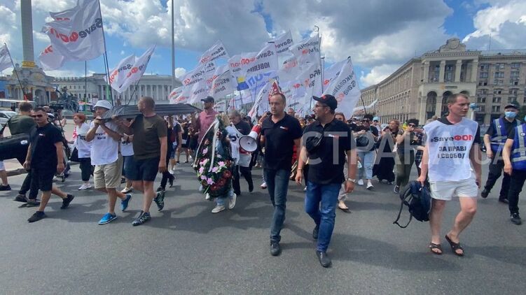 ФОПы хотели пройти маршем к Офису президента, а затем к Верховной Раде, но правоохранители начали их блокировать из-за того, что участники акции хотели пронести с собой гроб и ритуальные венки.