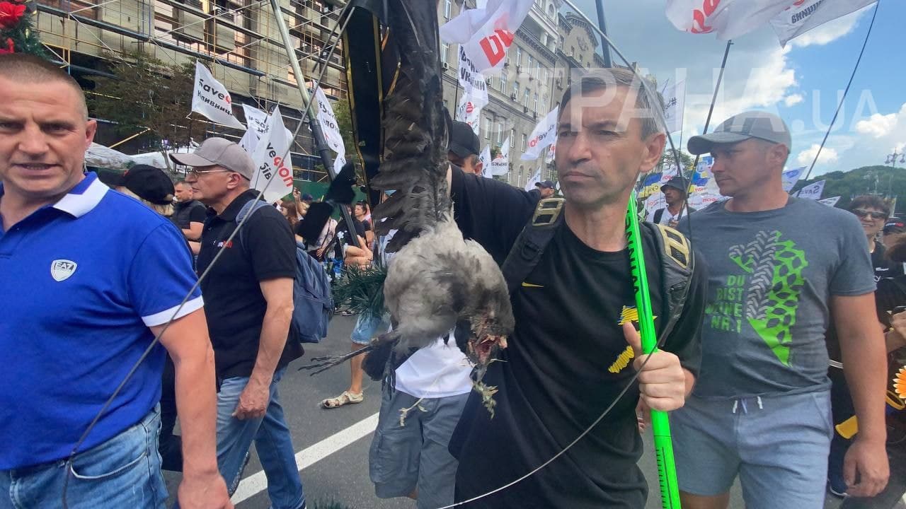 У одного из участников была замечена мертвая птица. Участник протеста заявил корреспонденту "Страны", что эта мертвая птица символизирует текущее состояние Конституции Украины