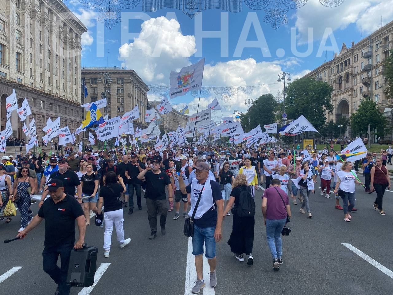 Протестующие поменяли маршрут. Они направляются к Офису президента, а затем к Верховной Раде. Сейчас колонна идёт по улице Крещатик, движение транспорта заблокировано. Правоохранителям удалось изъять всю траурную символику. ФОПы идут с флагами SAVEФОП.