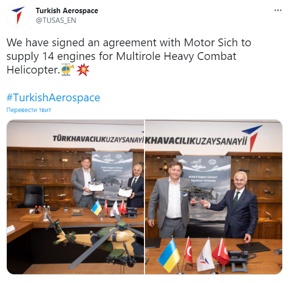 Турецкая оборонная компания Turkish Aerospace Industries подписала контракт с "Мотор Сич" на поставку 14 вертолетных двигателей. Соглашение заключено во вторник, 29 июня, сообщается на официальной странице турецкого предприятия в Twitter.