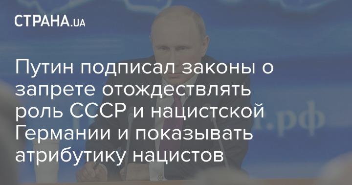 Президент РФ Владимир Путин подписал закон о запрете публично отождествлять цели и действия СССР и нацистской Германии во Второй мировой войне, а также отрицать решающую роль советского народа в победе над фашизмом.