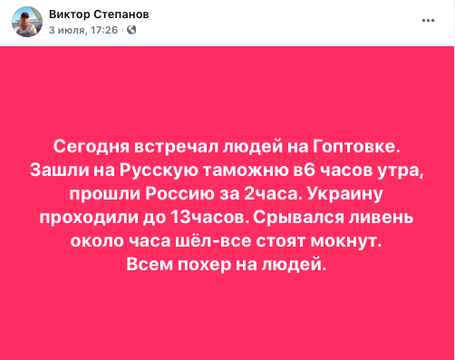 Пользователь Фейсбука Виктор Степанов сообщил о том, что 3 июля встречал людей в пункте Нехотеевка - Гоптовка.