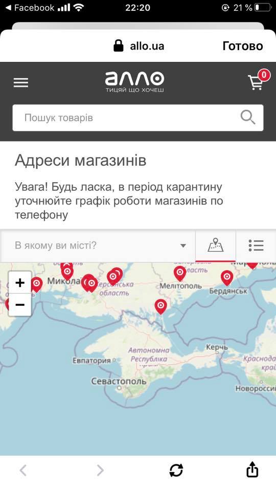 В июне позапрошлым летом компания "Алло" использовала на своем сайте карту, где Крым был, но его отделили чем-то вроде границы.