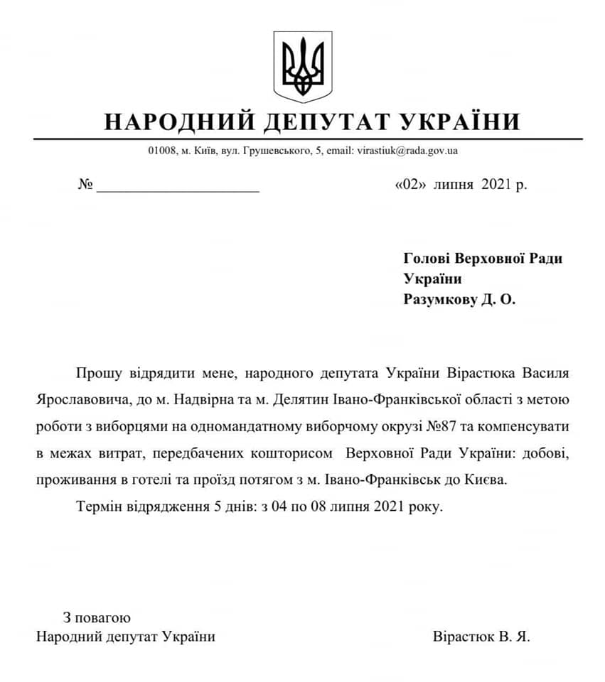 "Прошу отправить меня, народного депутата Украины Вирастюка Василия Ярославовича, в города Надворную и Делятин Ивано-Франковской области с целью работы с избирателями на одномандатном округе №87 и компенсировать в пределах расходов, предусмотренных сметой Верховной Рады Украины: суточные, проживание в гостинице и поездом с Ивано-Франковска в Киев", - говорится в заявлении Вирастюка к председателю Рады Дмитрию Разумкову.