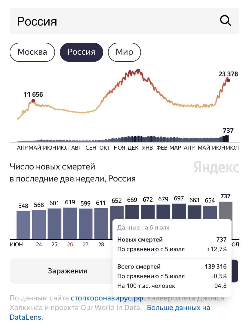 В России за последние сутки от Covid-19 скончались 737 человек. Этот показатель смертности на 12,7% выше показателя предыдущего дня. Он является максимальным с начала пандемии.