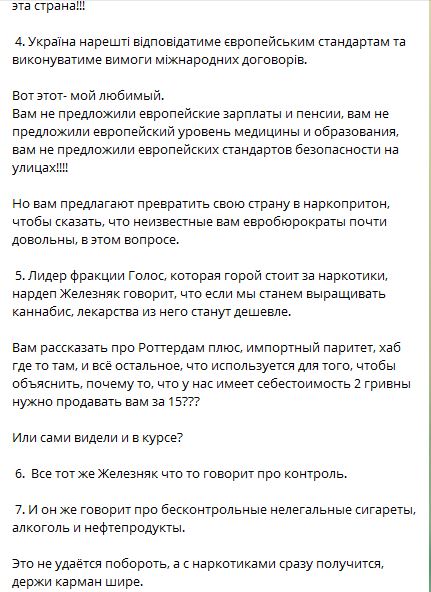 "Очень коротко, по поводу легализации каннабиса, которую фракция "Голос" и половина фракции "Слуга Народа", при трогательной поддержке союзных "Европейской Солидарности" и "Довиры" тащат в зал на следующей неделе.