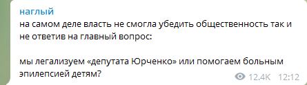 Мы легализуем "депутата Юрченко" или помогаем больным эпилепсией детям?" - написал журналист Макс Назаров (напомним, что во Львове нардепа Юрченко обвиняют в ДТП и драке под наркотиками).
