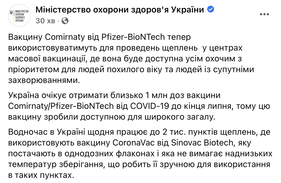 "Украина ожидает получить около 1 млн доз вакцины Comirnaty/Pfizer-BioNTech от Covid-19 до конца июля, поэтому Министерство здравоохранения решило сделать эту вакцину доступной для широкой общественности", - заявили в ведомстве.