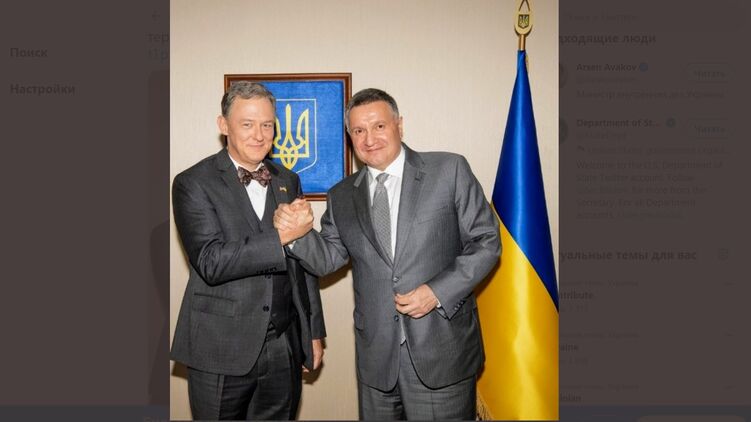 "Ну что ж. Джордж Кент, новый глава американского посольства в Киеве с особыми полномочиями, уже в Украине. Что характерно, первое фото с ним из всех политиков и чиновников выложил глава МВД Арсен Аваков", - заметил канал.