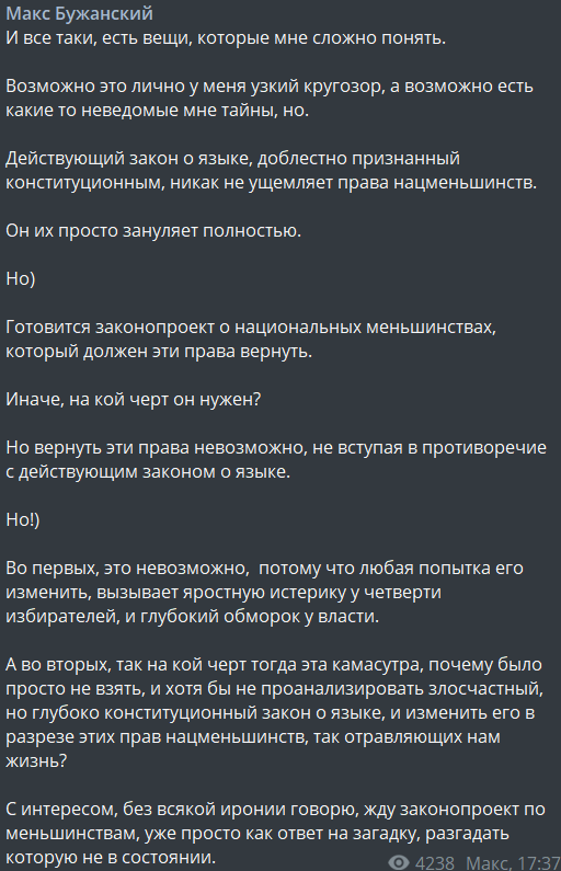 "Действующий закон о языке, доблестно признанный конституционным, никак не ущемляет права нацменьшинств.