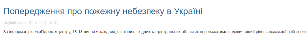 По данным Государственной службы Украины по чрезвычайным ситуациям, с 16 по 18 июля в западных, северных, восточных и центральных областях будет преобладать чрезвычайный уровень пожарной опасности.