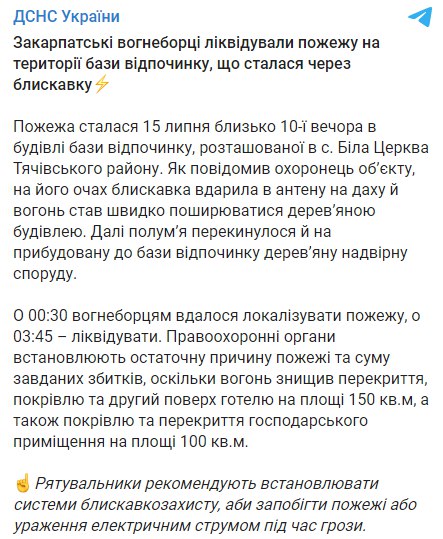 В Закарпатской области загорелась база отдыха из-за попадания в нее молнии