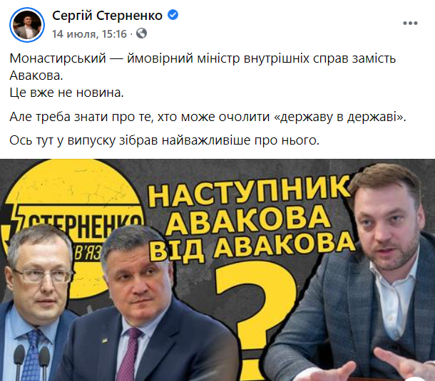 Так, одесский радикал Сергей Стерненко заявил, что Монастырский - "преемник Авакова от Авакова". Хоть это и не так, но свое негативное отношение к Денису данная часть грантовой тусовки высказала.