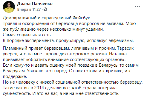 "Медведчуковская пропагандистка с низкой социальной ответственностью Диана Панченко поедет к Лукашенко открывать Славянский базар. После такого можно и не возвращаться. Теперь на ней ответственность за жертвы свихнувшегося диктатора", - написал известный "порохобот" Тарас Березовец.