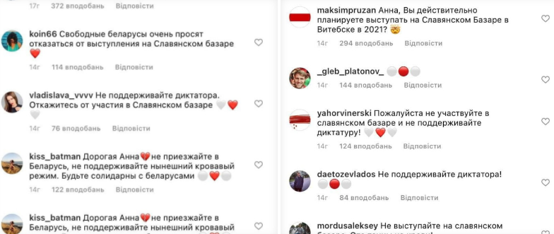 Оппозиционно настроенные белорусы просили этих артистов не ехать на "Славянский базар", чтобы "не поддерживать диктатора" и "кровавый режим". Вот скриншот некоторых комментариев, которые они оставили Анне Корсун (настоящее имя певицы Мaruv).