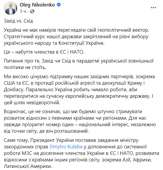 Вопрос о том, Запад или Восток, в парадигме украинской внешней политики не стоит. Мы высоко ценим поддержку наших западных партнеров, в частности США и ЕС, в противодействии российской агрессии и деоккупации Крыма и Донбасса. Параллельно Украина делает немало работы, чтобы превратиться в современную европейскую демократическую державу. И этот путь неизбежен.